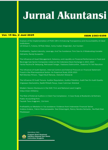 Jurnal Akuntansi is published by UNIB Press and collaborated with the Department of Accounting, Faculty of Economics and Business, University of Bengkulu. This journal contains are accounting research that includes Financial Accounting, Public Sector Accounting, Management Accounting, Economy, Islamic Financial Accounting and Management, Auditing, Corporate Governance, Ethics and Professionalism, Corporate Finance, Accounting Education, Taxation, Capital Market, Banking and contemporary issue about accounting. The Accounting Journal obtains an E-ISSN online (2303-0364) and prints ISSN number (2303-0356) on November 30, 2012.