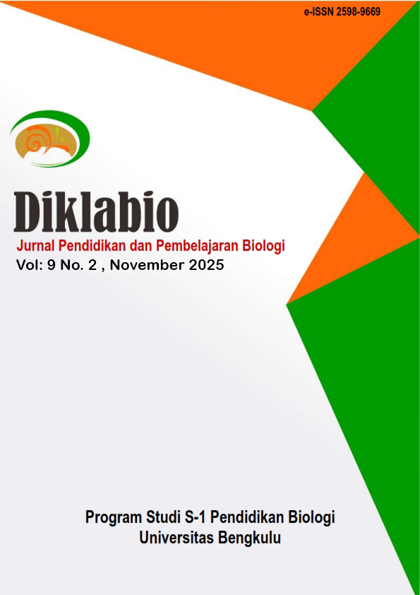 Diklabio: Jurnal Pendidikan dan Pembelajaran Biologi, is a open access journal in biology education and learning that publishes research results in the field of biology education and learning at the secondary school and higher education levels. Diklabio’s first edition was published in 2017. The journal publication is maintained by the Biology Education Department at Universitas Bengkulu, Bengkulu, Indonesia with the ISSN (online): 2598-9669; and ISSN (print): 2598-9634. Article manuscripts are published after a thorough Double peer review process.